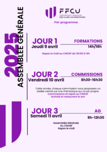 Comme chaque année, les rencontres débuteront dès le jeudi 9 avril avec des formations ouvertes à tous : bénévoles, salarié(e)s et élu(e)s, suivies, le vendredi 10 avril, de la réunion des commissions et du Conseil d’Administration.